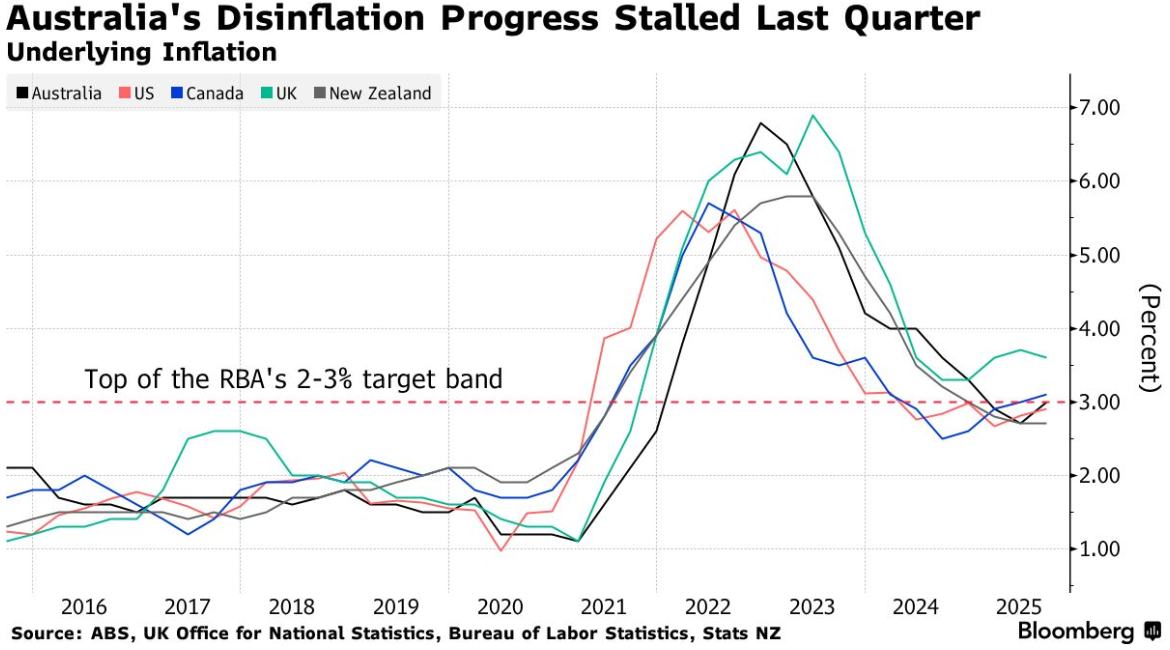 自 8 月份降息三次后,澳洲联储已将利率维持在 3.6% 不变。澳洲联储主席米歇尔·布洛克 上周警告称,如果物价压力证明是顽固的,下一步行动很可能是加息。在第三季度通胀率突破其 2-3% 目标区间的上限后,澳洲联储采取了依赖数据的立场。
